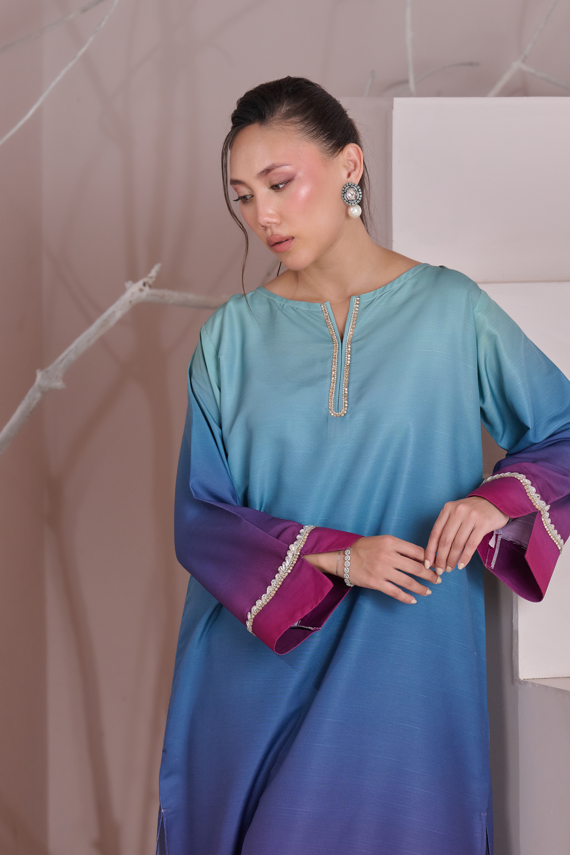 Drape yourself in effortless elegance with this Teal, Blue & Magenta Ombre 3-Piece Set, designed for a graceful and timeless look. Crafted in premium Crepe Silk, this outfit features a beautifully blended ombre effect with a stunning digital print that adds a luxurious touch. The look is further enhanced with delicate crystal embellishments around the neckline and sleeves, giving it the perfect amount of sparkle. A classy statement outfit, ideal for festive gatherings, parties, and special occasions.